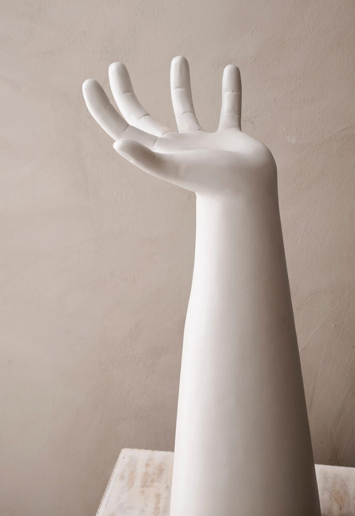 Piedestal formad som en hand, gjord av aluminium och med matt yta, från Ellos Home. Läs mer och köp här.